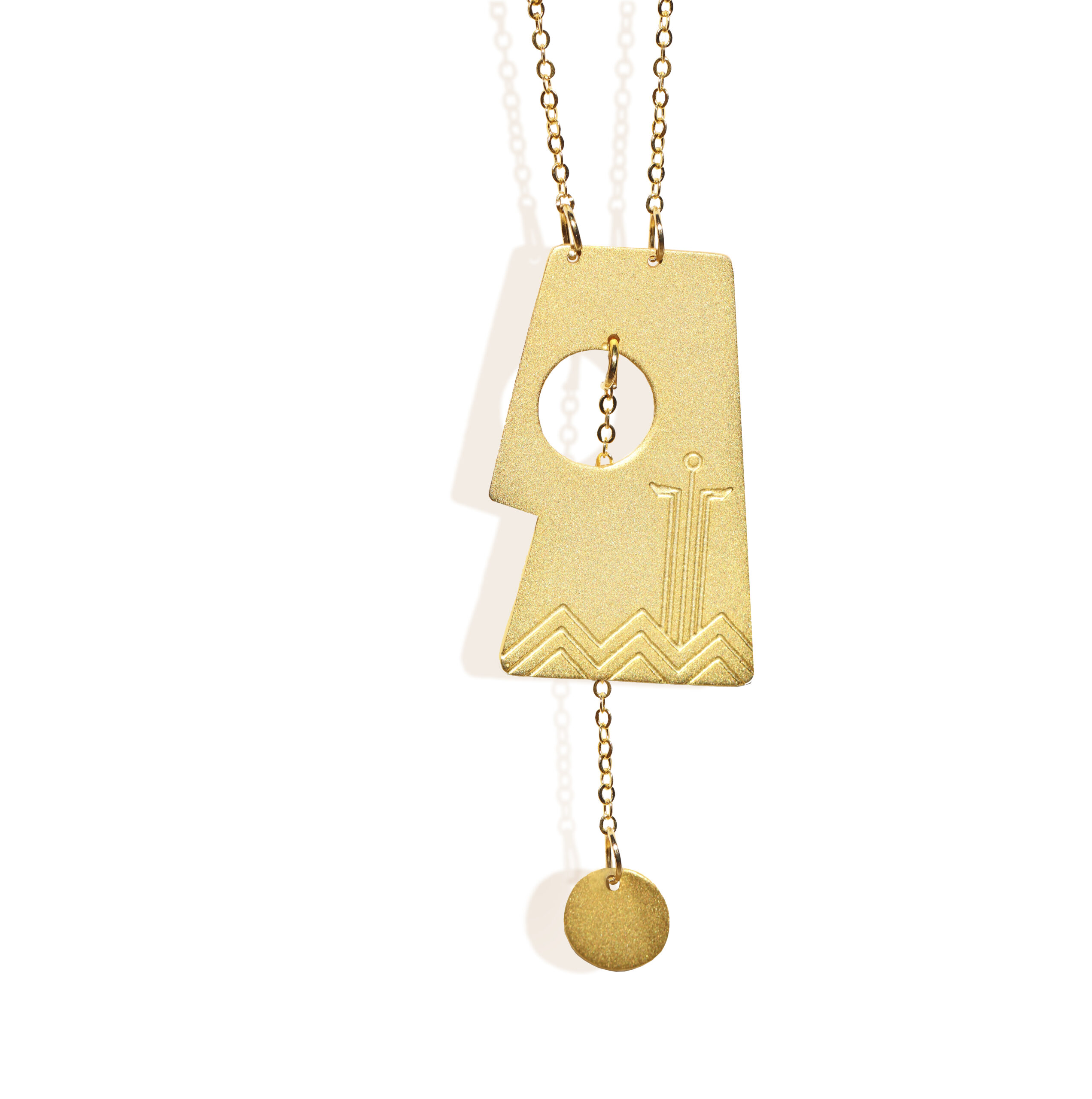Our Aten necklace (18k gold plated finish) size will be approximately Height: 5 cm, Width: 3 cm – chain length 50-55 cm