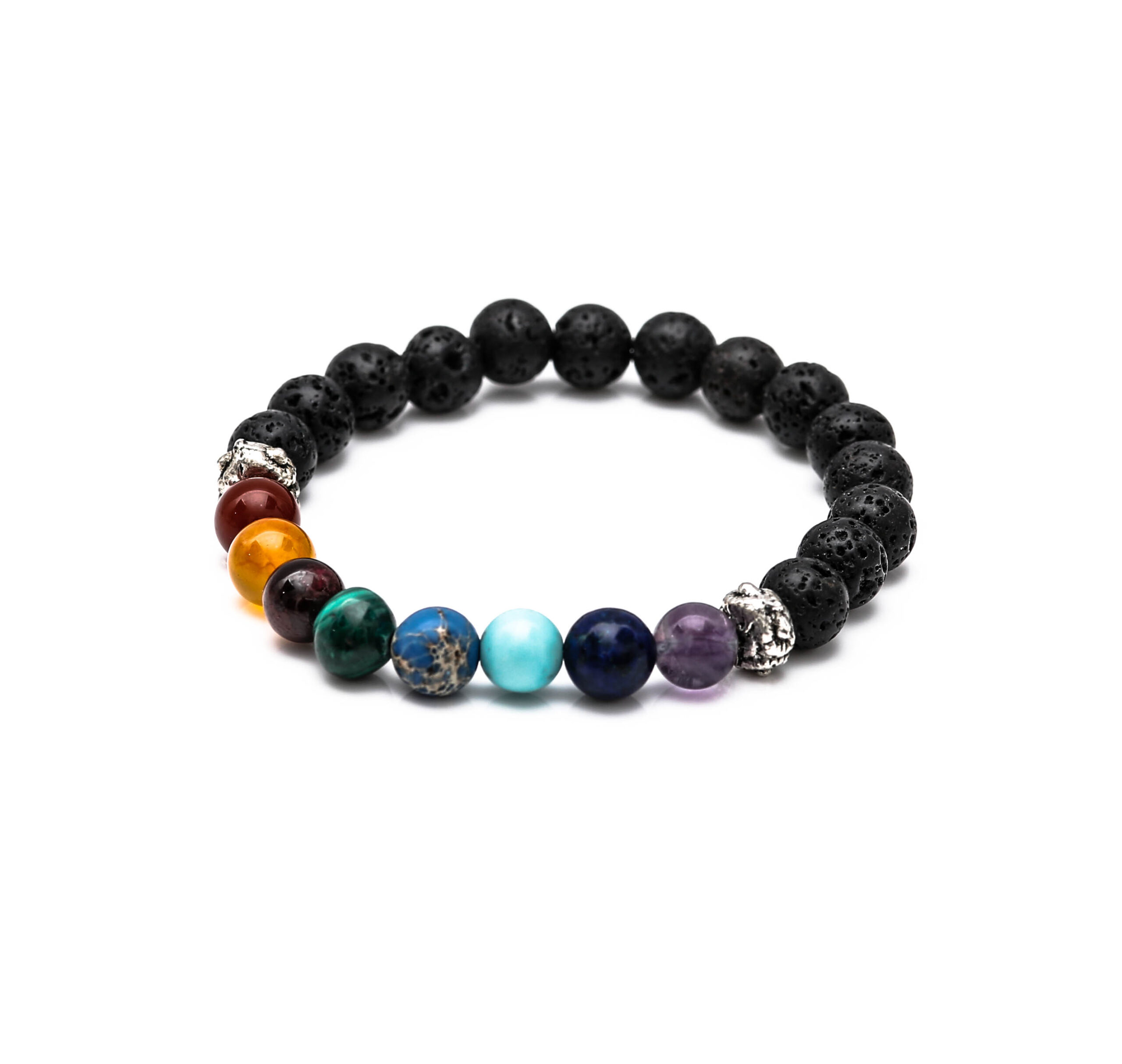 Our Healing bracelet – Chakra bracelet is one of our very unique pieces. Chakra bracelets are accessories and they have healing powers. Therefore they wore in India for centuries. More recently their popularity has spread around the world to fashion and cultural hot spots. Hence Chakra bracelet is a healing bracelet that has volcanic lava beads also known as basalt. red jade, carnelian agate, garnet, malakite, blue howlite, genuine sinia turquiose, lapis lazuli, and flurite.